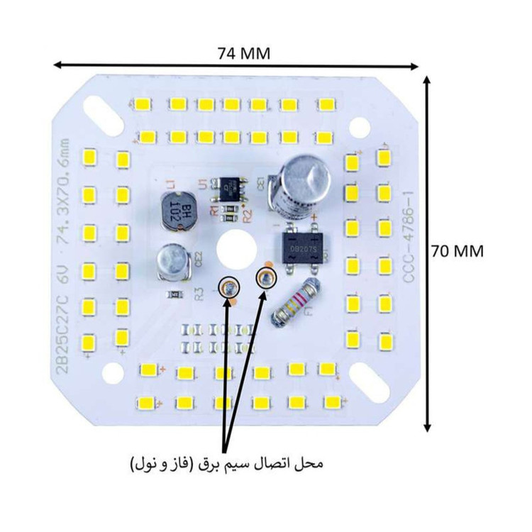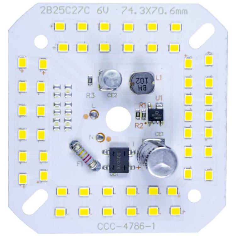 این چیپ مجهز به خازن آنتی شوک میباشد که هم از لرزش و چشمک زدن نور جلوگیری میکند و هم باعث افزایش نور چیپ میشود . این چیپ با برق مستقیم شهری 220 ولت روشن میشود و در تعمیر یا ساخت لامپ ها و پرژکتورها و پنلهای ال ای دی استفاده میشود . جهت استفاده از این چیپها پیشنهاد میشود با استفاده از خمیر سیلیکون به خنک کننده آلومینیومی heat sink مناسب به منظور جلوگیری از افزایش دمای چیپ و کاهش عمر محصول چسبانیده شود. این محصول دارای 50 عدد ال ای دی شار نوری 5250 لومن و طول عمر 40000 ساعت میباشد. روی چیپ دو حرف L و N وجود دارد که فاز و نول به آنها متصل میشود .
