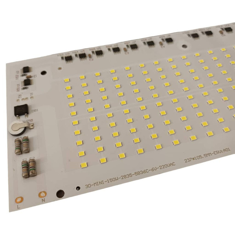 چیپ پرژکتوری 150وات ، SMD(بلالی)، با برق مستقیم 220 ولت کار میکند ، دارای سنسور دما که وقتی حرارت هیت سینگ (آلومنیوم)از حدنصاب بالا می رود این سنسور واتِ چیپ را پایین می آورد و اجازه نمی دهد چیپ بسوزد دارای 6 مقاومت است که کیفیت چیپ را بالا برده است حداقل وزن هیت سینگ(آلومینیوم) برای خنک کردن این چیپ 2کیلو آلومنیوم است دارای چُک الکترونیکی است که درمقابل نوسان برق مقاوم است ابعاد قاب چیپ207x105 میلیمتر است، ابعاد چیدمان چیپ که برای خیلی ها سوال میشود 18.5x6.5 سانتیمتر است