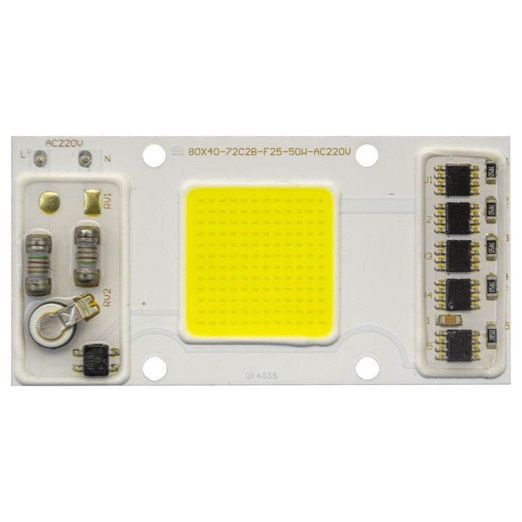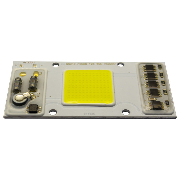 این چیپ ال ای دی با برق مستقیم شهری (220 ولت) روشن میشود و با استفاده از بهترین و با کیفیت ترین قطعات الکترونیکی موجود در بازار ساخته شده است . توان خروجی این محصول 50 وات است که میزان روشنایی آن 4500 لومن میباشد و ضریب قدرت آن 0.9 است . (ضریب قدرت در صنایع روشنایی عددی بین 0 تا 1 است که هرچه این عدد به یک نزدیکتر باشد دارای بازده بیشتر و مصرف کمتری است) . طول عمر این محصول 40000 ساعت میباشد . روی چیپ دو حرف L و N وجود دارد که فاز و نول به آنها متصل میشود .